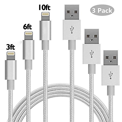 StrikeKing iPhone Cable,3Pack 3FT 6FT 10FT Nylon Braided Lighting to USB Cable Charging Cord for iPhone 7/7 Plus,6/6S/6 Plus/6S Plus,5/5S/5C/SE,iPad,iPod,iPod Touch (White)