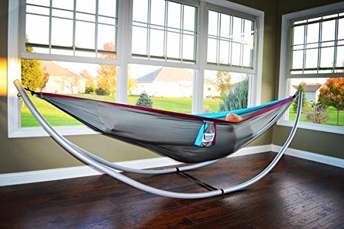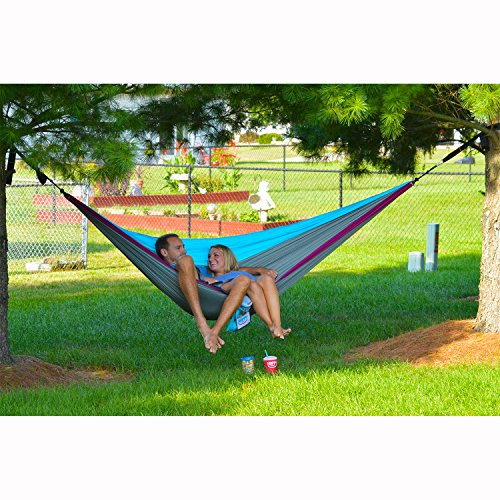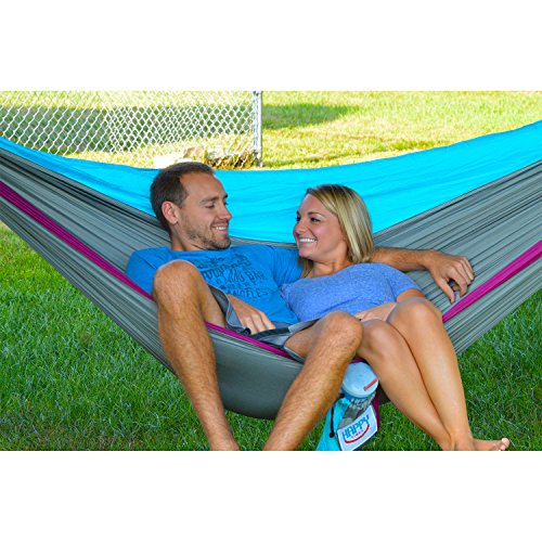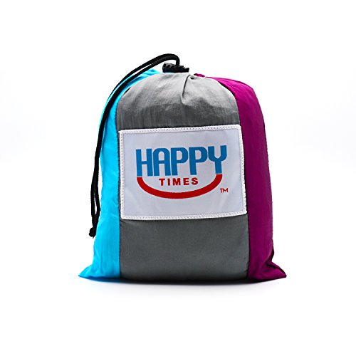 DOUBLE CAMPING HAMMOCK – Versatile and compact double camping hammocks measure 10’ 4” long by 6’ 4” wide. When it’s not in use it conveniently folds into the attached gear pouch measuring 6”x 8” and only weighs 18 ounces which makes it the perfect portable hiking or backpacking hammock. (Check out our indoor/outdoor Happy Times portable camping hammock stand on Amazon for your next adventure)