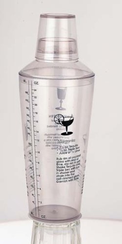 -. Feature : Classic cocktail recipes P.R.Inted on shaker for reference / Built in strainer cap / Shaker cap doubles as a shot glass / Hand washing recommended / 24 ounce capacity