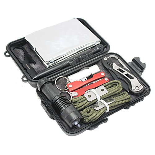 MULTI-FUNCTION TOOLS: Portable waterproof tool case, inside is everything you need to help you survive: fire starter shoelace, knife, whistle, flashlight, multipurpose flash light pliers, tactical pen, emergency blanket, multiple use edc keyring tools