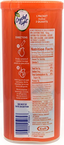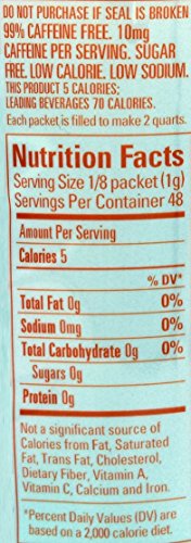 -. Feature : Each Canister Contains 6 2-Quart (6-2 Liter) Packets / 99% Caffeine Free (10 mg Caffeine Per Serving) / Low in Sodium and Kosher / Each 8 Ounce (237 ml) Serving Contains 5 Calories