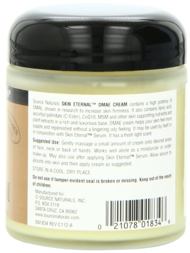 ReleaseDate : 2006-06-21 Studio : Source Naturals Publisher : Source Naturals Binding : Health and Beauty Product Description Source Naturals Skin Eternal DMAE Cream contains a high potency of DMAE, shown in research to increase skin firmness. It also contains lipoic acid, ascorbyl palmitate (C-Ester), CoQ10, MSM and other skin supporting nutrients and plant extracts in a rich and luxurious base. DMAE cream helps your skin feel more supple and replenished without a lingering oily feeling. It may be used by itself or in conjunction with Skin Eternal Serum. It has a fresh light scent. 0