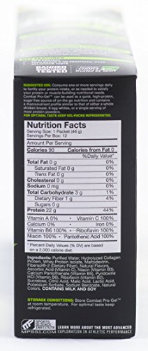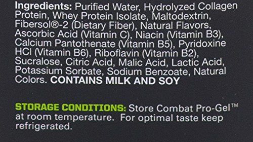COMBAT PRO GELS are a high-protein, great-tasting, convenient snack that provide essential nutrients used to build and maintain lean muscle mass. Each serving features 22 grams of high-quality protein, zero sugar, no artificial dyes, and all 9 essential amino acids to effectively fuel your muscles while on the go!Feature
