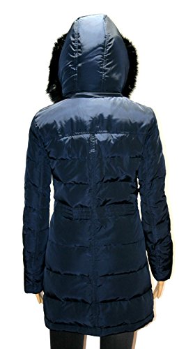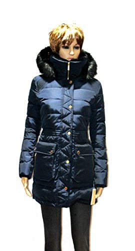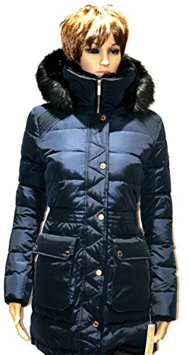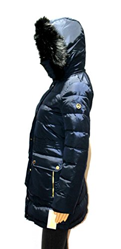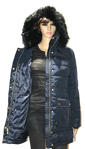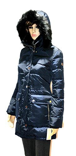 Zipper closure with snap overlay at front Long sleeves Flap and zipper pockets at hips Quilted puffer styling Cinched waist Stand collar with faux fur; removable zip-off hood with faux fur trim and drawstrings Machine washable