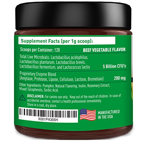 DOG PROBIOTICS PREBIOTIC POWDER - 120 grams, 120 scoops per jar, 5 probiotic strains, 5 billion CFUs per scoop, Inulin prebiotic, Beef Vegetable Flavor. For dog allergies, constipation relief, gas, bad breath, hot spot treatment, itchy skin relief, healthy coat, shedding, itching. Safe for small, medium, large, giant breeds, puppy, adult, senior dogs. NO REFRIGERATION NEEDED