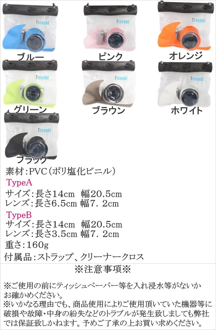 思い出をきれいな画像で残そう♪ 海やプール、お風呂場で大活躍するカメラ防水ケースです。 ※商品特性上多少の色移り、汚れなどある場合がございます。予めご了承の上お買い求めください。 ※いかなる理由でも、商品使用によりご使用頂いていた機器等に破損や故障・中身の紛失などのトラブルが発生致しましても弊社では保証致しかねます。 予めご了承の上お買上求めください。
