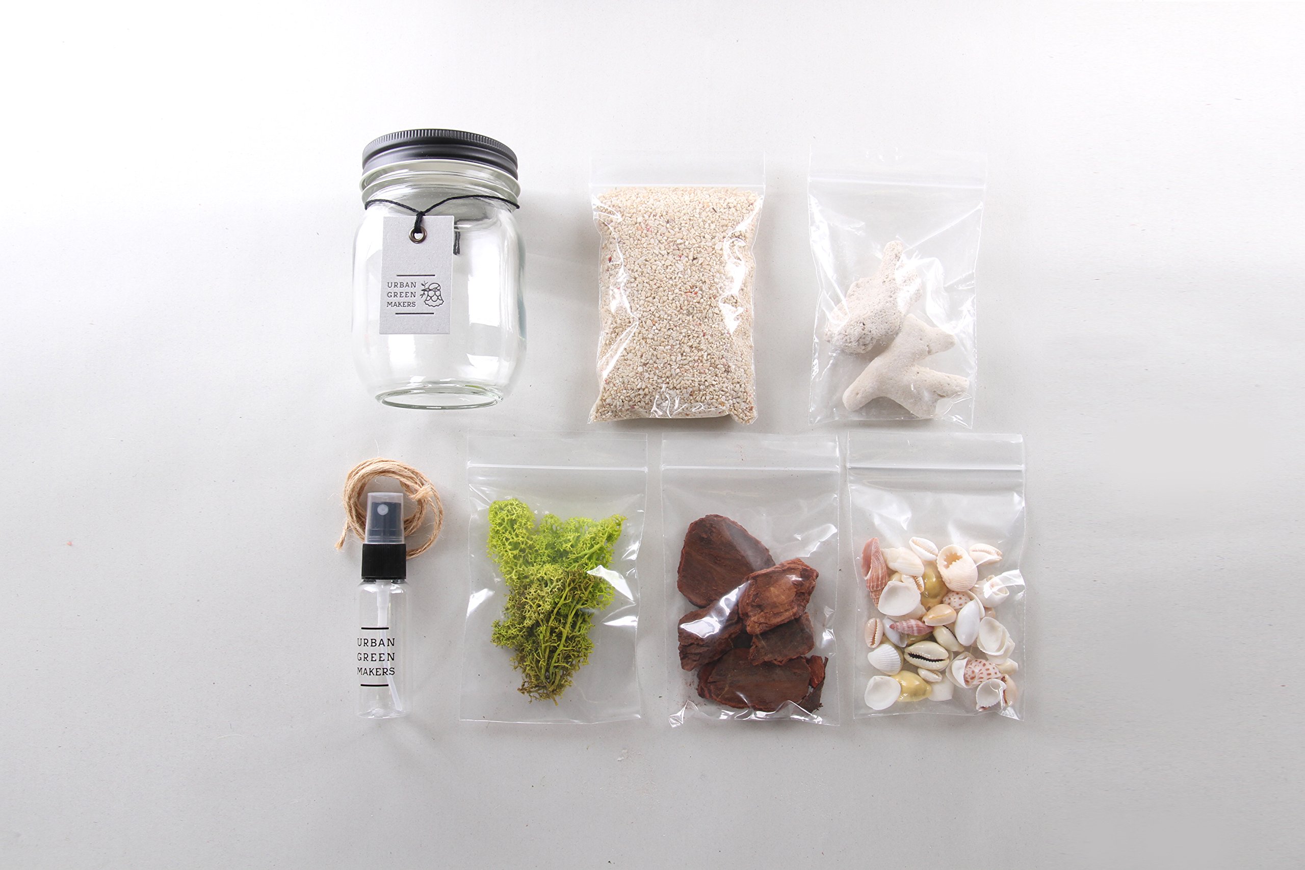 [Contents] Glass Jar, Spray, Reindeer Moss, Coral Sand, Coral Sand, Mixed Shell, Bark Chip, Hemp Twine