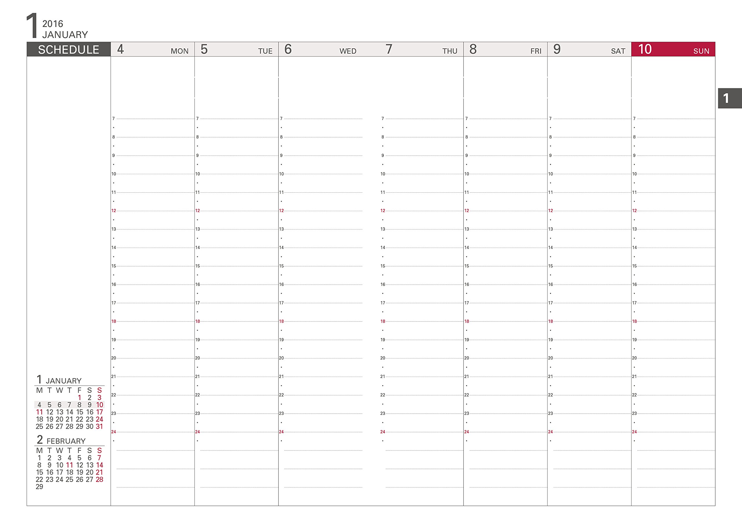 · The weekly part is even vertical type from Monday to Sunday and the schedule from 7 am to 24 o'clock in the morning is available for one day.
