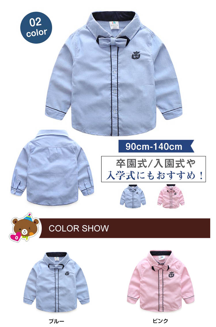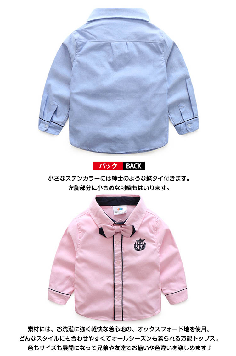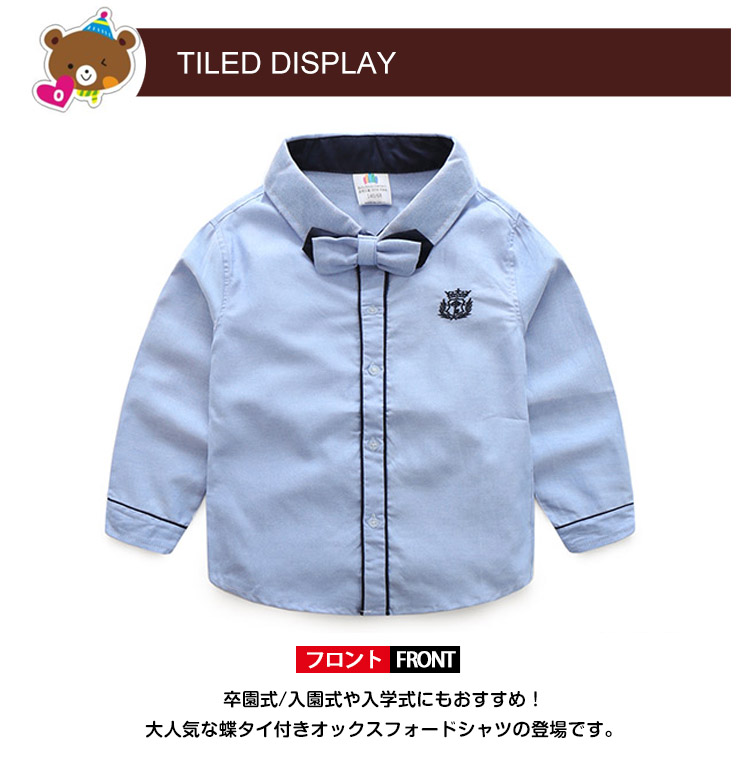 | 卒園式/入園式や入学式にもおすすめ!大人気な蝶タイ付きオックスフォードシャツの登場です。小さなステンカラーには紳士のような蝶タイ付きます。左胸部分に小さめな刺繍もはいります。素材には、お洗濯に強く軽快な着心地の、オックスフォード地を使用。どんなスタイルにも合わせやすくてオールシーズンも着られる万能トップス。色もサイズも展開になって兄弟や友達でお揃いや色違いを楽しめます♪ | |