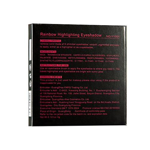 -. Feature : Pressed powder, 6 Color in 1, natural shimmer, glitter shade. / Rainbow highlighter to create an amazing makeup. / Silky smooth application to enhance skin tone. / Mirror inside, easy to use. / Suitable for all skin types.