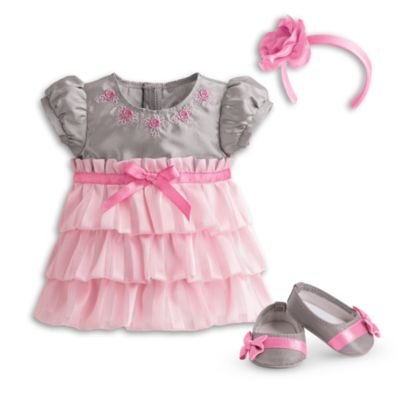 -. Feature : Bitty Baby will look so sweet in this darling party dress! The outfit includes: / A dress made of silver taffeta, with floral embroidery at the neck and lots of pink ruffles on the tiered skirt / A satin headband adorned with a big bloom / Silver shoes with pink bows to complete the outfit