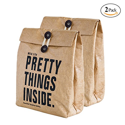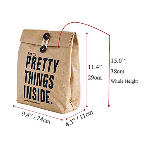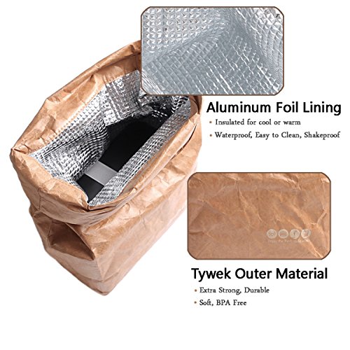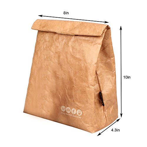 -. Feature : Insulated Lunch Sack - Built-in 3mm Aluminum foil lining, the brown paper lunch bag offers great thermal resistance keeping lunch food, fruit and juice fresh, cool or warm / Super Strong Bag - Made of Tyvek material, brown kraft paper bag is soft but extra strong, tear-proof and leakproof, heavy duty and durable for storing milk, lunch box, water bottle, etc / Eco-friendly Lunch Bag - Large brown paper lunch bag measures 10" x 8" x 4.3", reusable and recycled, easy to take with the hook and loop design to be a handle / Easy to Store & Clean - The lunch bag is foldable for better store, easily folded up into handbag or backpack once emptied; wipe clean with a damp cloth and leave it to dry / Vintage Style Storage - Great lunch bag for both kids and adults go to school, work, picnic taking fresh and health lunch; you can write your name on it
