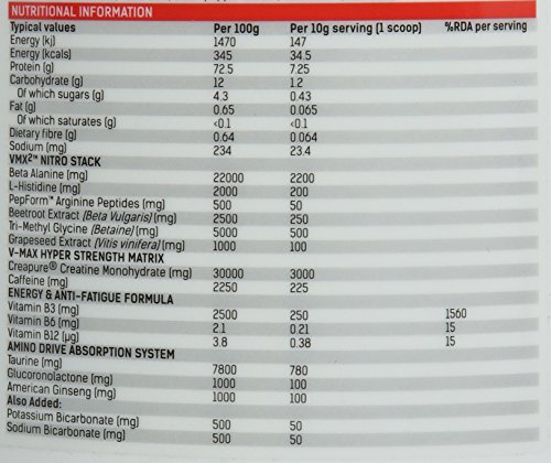 Studio : PhD Nutrition Publisher : PhD Nutrition Binding : Health and Beauty Product Description Hardcore pre workout drink to reduce tiredness fatigue ?Creatine can increase physical performance 1.2g of carbohydrates per serving 225mg Caffeine per serving No added colouring PhD VMX, ultra-concentrated, super-strength matrix of performance boosting ingredients, represents the ultimate evolution in pre-workout nutrition. VMX2A® is so concentrated, we have even left all colouring out, in order to fit in the necessary active ingredients to ensure an even greater pre-workout experience. This advanced, high-powered formula contains only serious ingredients such as Beta Alanine, Peptide bonded L-Arginine, the Nitrate-rich Beta Vulgaris, the patented Creatine Monohydrate a?CreapureA®a? and a full strength Vitamin B matrix, to provide you with the catalyst to increase your training intensity, strength and delay fatigue and tiredness. VMX2?contains just 1.2g of carbohydrates per serving and less than 0.5g of added dextrose, to ensure it is suitable for athletes on a low carbohydrate diet seeking only the leanest of muscle gains. Prime your muscles for growth realisation by using VMX2A® before every intense exercise session. Body builders lifting heavy weights for repeated working sets Power lifters seeking an increase in explosive strength Any athlete looking to improve performance during exercise Team sport participants seeking short burst strength and match endurance HIgh caffeine content. 225mg per 10g daily serving. Not recommended for children or pregnant or breast feeding women 0