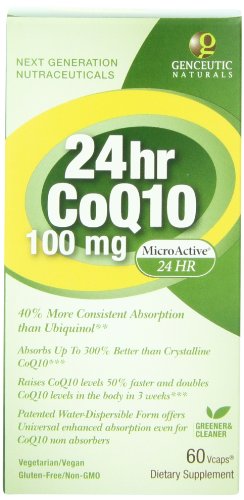 Studio : Genceutic Naturals Publisher : Genceutic Naturals Binding : Health and Beauty Product Description What is COQ10? Structurally related to vitamin K, coenzyme q10 (COQ10) is a member of the ubiquinone family of compounds. The name ubiquinone refers to the ubiquitous (i.e. Found everywhere) presence of these compounds in living organisms, which reflects the importance of COQ10 to human health and metabolism. Some of COQ10's major functions include: 1) the conversion of glucose and fatty acids to ATP, the form of energy used to power most body functions1, 2) supporting special enzymes that clean up cellular debris within cells , and 3) acting as a powerful, fat-soluble antioxidant in cells, inhibiting lipid peroxidation in cell membranes, DNA and low-density lipoproteins. In addition to these essential functions, COQ10 has a number of valuable support roles to play in human health. These roles include promoting immune function, gum health, gastric membrane health, physical performance, cardiovascular health, glucose and insulin balance, and quality of life. Genceutic natural's 24hr nano COQ10 100 mg supplement has distinct advantages over ordinary coco10. First of all, its patented, nano sized COQ10 and ß-cyclodextrin matrix it is significantly more stable, retaining much greater stability against heat and light. Secondly, this matrix showed a sustained release and bioavailability was significantly better than ordinary COQ10 by a factor of 3.7. In addition, genceutic natural's 24hr nano COQ10 matrix has 40% more consistent absorption than ubiquinol, a metabolized form of COQ10 often touted as having superior absorption. Scientists around the world have been daily with meals. Researching the important benefits of COQ10, which include supporting cardiovascular wellness and cellular energy. 24 hr COQ10 100 mg supplies 24 hour sustained release micro active COQ10 complex, patented for bonding COQ10 with β-cyclodextrin. This water-dispersible form offers universal enhanced absorption. 0
