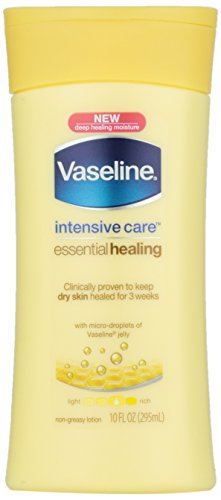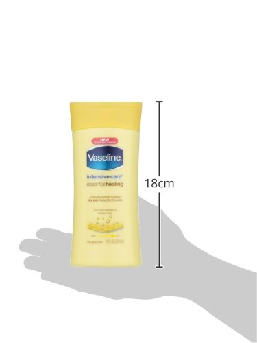 Vaseline Intensive Care Essential Healing Lotion provides fast absorbing moisture to give you deeply moisturized, healthy skin. Clinically proven to keep dry skin healed for 3 weeks*, it's a body lotion you can count on. *Proven after 4 weeks daily use in a clinical study Moisturizes Deep Down to heal dry skin Every day, your skin is exposed to damaging environmental factors like extreme temperatures, low humidity, harsh cleansers and hot water. This is why Vaseline body lotions are designed to penetrate the stratum corneum (outermost layer of the skin) to heal dry skin, not just provide temporary, superficial relief. Vaseline Intensive Care Essential Healing Lotion is formulated with a special blend of glycerin, a humectant that draws moisture to the skin, and Vaseline Jelly, which locks in moisture. Its deeply moisturizing formula provides effective, long-lasting skin hydration. With such nourishing ingredients, Vaseline Intensive Care Essential Healing Lotion is the perfect daily body lotion for maintaining smooth, soft skin. Non-Greasy Body Lotion Vaseline Intensive Care Essential Healing Lotion relieves dry skin quickly by penetrating skin layers with its fast absorbing formula. Its light and non-greasy formula glides onto your skin effortlessly to provide a clean, deeply moisturized feeling without the greasy feel. Ideal for when you want to get on with your day, this body moisturizer absorbs quickly, so you can get dressed within minutes of application.Feature