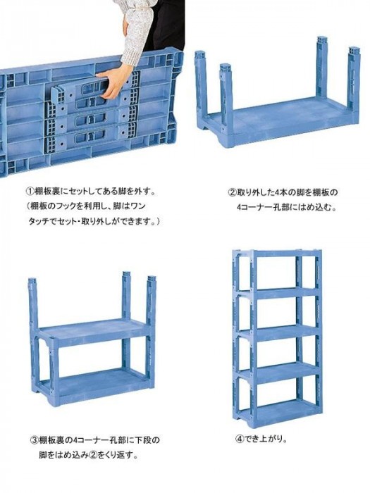 工具を使用せず、簡単に組み立てできるプラスチック製の棚です。 製造国:日本 セット内容:棚板×5枚脚×16本※お届け地域により、別途運賃がかかる場合やお届けできない場合がございますので、お問い合わせ下さい。
