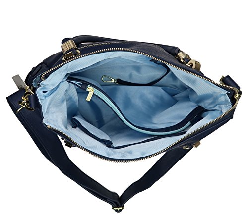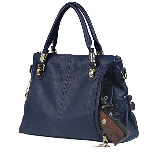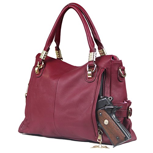 Product Description Add some flair to your style as you ensure your personal safety. The concealed carry J. Dawn concealment purse is back with new colors and locking zippers! Product Summary: The J. Dawn II concealed carry purse by Lady Conceal is crafted with soft, pebbled leather. With a gathered pocket on each end and a brass zippered pocket in front, this purse has many storage options. The spacious interior is secured with a classy brass zipper. The fully lined 100% polyester interior features two open slip pockets, a large zippered pocket plus a zippered center divider pocket for your cell phone and daily necessities. You will also find an interior leather lanyard with a brass swivel snap for keys. With dual strap options, one has the choice to use the two round leather handles or the adjustable shoulder strap for cross body use. The double ply, adjustable cross body strap easily clips on and off and measures 25"- 46" by 1-1/8" (drop 12" - 24"). Round handles measure 15" long with 4-1/2" drop. A signature Miss Conceal emblem on the front speaks quietly to its elegance and power. Concealment: The locking concealed carry compartment is located on the back of the purse and measures approximately 6" tall x 9" wide. It is designed for right or left-handed users and includes 4 locking keys. It is constructed of ballistic nylon and can accommodate up to a large frame handgun. A universal holster is included which features Velcro hooks on both sides for a secure fit in the concealment pocket. Purse Dimensions: 10.5" tall x 14" wide x 2-1/2 (top) 5" (bottom)" deep