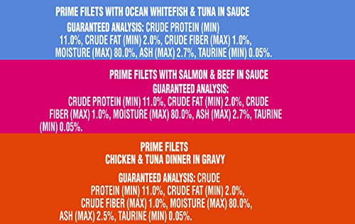Guaranteed Analysis:Prime Filets with Ocean Whitefish & Tuna in Sauce: Crude Protein (Min)...11.0%, Crude Fat (Min)...2.0%, Crude Fiber (Max)...1.0%, Moisture (Max)...80.0%, Ash (Max)...2.7%, Taurine (Min)...0.05%. Prime Filets with Salmon & Beef in Sauce: Crude Protein (Min)...11.0%, Crude Fat (Min)...2.0%, Crude Fiber (Max)...1.0%, Moisture (Max)...80.0%, Ash (Max)...2.7%, Taurine (Min)...0.05%. Prime Filets Chicken & Tuna Dinner in Gravy: Crude Protein (Min)...11.0%, Crude Fat (Min)...2.0%, Crude Fiber (Max)...1.0%, Moisture (Max)...80.0%, Ash (Max)...2.5%, Taurine (Min)...0.05%.