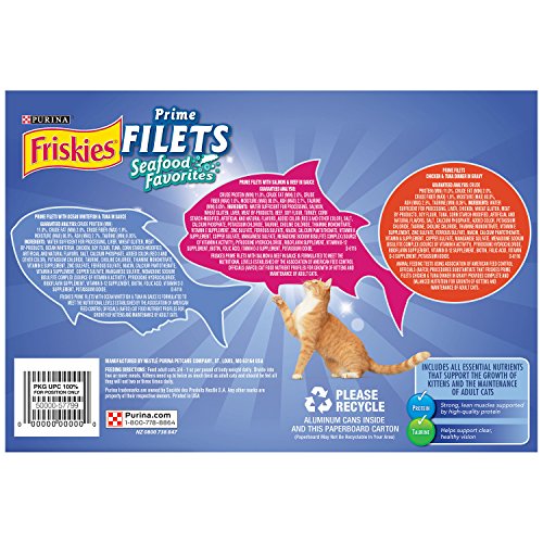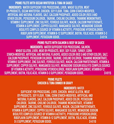 Ingredients:Prime Filets with Ocean Whitefish & Tuna in Sauce: Water Sufficient for Processing, Liver, Wheat Gluten, Meat-By Products, Ocean Whitefish, Chicken, Soy Flour, Tuna, Corn Starch-Modified, Artificial and Natural Flavors, Salt, Calcium Phosphate, Added Color (Red 3 and Other Color), Potassium Chloride, Taurine, Choline Chloride, Thiamine Mononitrate, Vitamin E Supplement, Zinc Sulfate, Ferrous Sulfate, Niacin, Calcium Pantothenate, Vitamin A Supplement, Copper Sulfate, Manganese Sulfate, Menadione Sodium Bisulfite Complex (Source of Vitamin K Activity), Pyridoxine Hydrochloride, Riboflavin Supplement, Vitamin B-12 Supplement, Biotin, Folic Acid, Vitamin D-3 Supplement, Potassium Iodide. D-6114. Prime Filets with Salmon & Beef in Sauce: Water Sufficient for Processing, Salmon, Wheat Gluten, Liver, Meat By-Products, Beef, Soy Flour, Turkey, Corn Starch-Modified, Artificial and Natural Flavors, Added Color (Red 3 and Other Color), Salt, Calcium Phosphate, Potassium Chloride, Taurine, Choline Chloride, Thiamine Mononitrate, Vitamin E Supplement, Zinc Sulfate, Ferrous Sulfate, Niacin, Calcium Pantothenate, Vitamin A Supplement, Copper Sulfate, Manganese Sulfate, Menadione Sodium Bisulfite Complex (Source of Vitamin K Activity), Pyridoxine Hydrochloride, Riboflavin Supplement, Vitamin B-12 Supplement, Biotin, Folic Acid, Vitamin D-3 Supplement, Potassium Iodide. D-6115. Prime Filets Chicken & Tuna Dinner in Gravy: Water Sufficient for Processing, Liver, Chicken, Wheat Gluten, Meat By-Products, Soy Flour, Tuna, Corn Starch-Modified, Artificial and Natural Flavors, Salt, Calcium Phosphate, Added Color, Potassium Chloride, Taurine, Choline Chloride, Thiamine Mononitrate, Vitamin E Supplement, Zinc Sulfate, Ferrous Sulfate, Niacin, Calcium Pantothenate, Vitamin A Supplement, Copper Sulfate, Manganese Sulfate, Menadione Sodium Bisulfite Complex (Source of Vitamin K Activity), Pyridoxine Hydrochloride, Riboflavin Supplement, Vitamin B-12 Supplement, Biotin, Folic Acid, Vitamin D-3 Supplement, Potassium Iodide. D-6110.