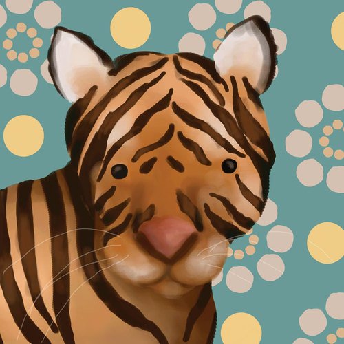 Children's stretched canvas wall art featuring black and orange striped tiger with blue and yellow dotted background.