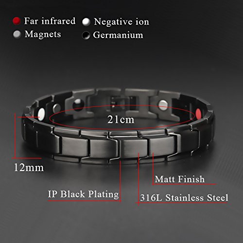 In our modern lifestyle are bodies are depleted of negative ions, with stresses such as electronics or air conditioning to blame. The Health bracelets are designed to release negative ions into your body the moment you put them on. Among the most powerful products of their type, Power release over 2000 negative ions a second. Condition: 100% Brand New High Quality Gender: Men Length: 22 CM Wide: 1.3 CM Plating: IPG Black Gun Plating Material: 316L Stainless Steel(Titanium Steel) Unique: Far infrared, Germanium, Magnet, Negative ion etc Energy: 2000-3500 ions Package includes: 1 x Bracelet, 1 x Gift Box, 1 x Instructions, 1 x Bracelet Tool Who Should Wear This Energy Bracelet : * If you have to use a computer or a cell phone for a long period of time * If you have to keep focused on your work for a long period of time * If your job requires you to stand or do laborious work for a long time and if you are a person who always has cold hands and cold feet * If you have problems such as tense nerves, poor blood circulation, or stiffness and shoulder and neck pains. * If you are weakly resistant to illnesses and catch colds easily. * If you have a stressful life style and want to relax and regain your energy. * If you have an irregular life style and are often sleepless. * If you are fond of sports and want to develop your sport fitness. Benefits: * Reduce muscle tension and increase flexibility - Injury prevention * Reduce fatigue and tension and thus enhance the ability to perform at optimum level * Improve blood circulation * Alleviate Discomfort and improve sleep 0 |