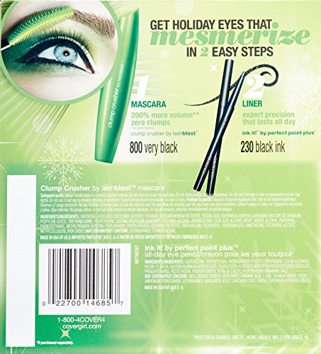 -. Binding : Health and Beauty -. Brand : COVERGIRL -. EAN : 0022700146857 -. Feature : The clump crusher brush delivers 200 percent more volume and zero clumps for beautifully separated lashes / Clump crusher mascara's innovative curved brush features a lash loading section to saturate lashes with loads of product and fine-tooth comb bristles to evenly distribute the mascara / Eyeliner gives you vibrant high impact color that glides on smoothly with pen-like precision for an intense eye liner look looks that last all day -. Label : CoverGirl -. Manufacturer : CoverGirl -. MPN : 22700146857 -. NumberOfItems : 1 -. PackageQuantity : 1 -. PartNumber : 22700146857 -. ProductGroup : Beauty -. ProductTypeName : BEAUTY -. PublicationDate : 2014-10-14 -. Publisher : CoverGirl -. ReleaseDate : 2014-09-08 -. Studio : CoverGirl -. Title : CoverGirl Clump Crusher Mascara and Ink Perfect Point Plus Holiday Gift Set -. UPC : 787461562000