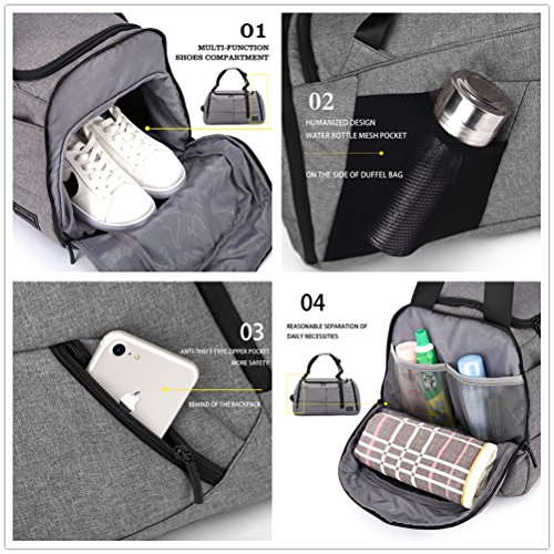 You want to get a duffel bag, and want a backpack? Why not both? Now you just only need to carry one bag to go outside! One bag offers at least three different ways of carrying and use, but you only need to spend buy one bag's money FEATURES: 1. Spacious carrying bag perfect for multiple-use, such as swimming, boxing, day trips, camping, university, sports practices, vacation, travel, yoga, gym sports etc 2. Has an easy-access internal pocket to securely hold your cellphone or wallet and an inner mesh pocket to keep other valuables secure inside 3. A detachable padded shoulder strap can easily turn the backpack into a messenger bag/crossbody bag/mail bag/shoulder bag 4. Made from durable material, main compartment has double zippered U-shaped lid with internal pocket keeps small essentials organized, waterproof, Anti-slip and anti-wear bottom, solid stitching reinforcement on all stress points, SBS zipper POCKETS: 1.Main compartment (with 1 mesh zipper pocket and 2 private zipper pockets inside) can place your notebooks, wallet, clothes and trousers, keys, cellphone, magazines, umbrella, camera etc 2. The front zipped compartment can hold your iPad /Kindle /Diary /Cellphone etc 3. One upgraded Shoes Compartment ventilated to keep your shoes and dirty gear separate (reference max shoes size: 15) 4. One Side Pocket can hold your wash towels, facial cleanser, toner, toothpaste and toothbrushes etc 5.There is an anti-theft zipper pocket can safety to place your cellphone and wallet SPECIFICATION: Material: Water and tear resistant Nylon fabric Dimension: 19.7*11*9.6 inch (L*H*W), fits most gym/club lockers, also fits fine in the overhead bins or under the seat when flying PACKAGE INCLUDES: 1*Duffel bag 0