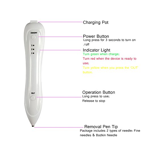 -. Feature : Unique electro-ion technology: This spot removal pencil adopts high-tech, electrical ion-carbonization features making it remove stains without hurting normal skin, no bleeding. / 3 Different setting Mole Remover Pen: There are 3 different output powers, the lower level is used on spot and freckle, the stronger level is used on mole and skin tags . / No pain no gain:recommend use with numb cream. / Wireless operation: Directly charge by USB line, easy carry and easy operate. It uses new generation of plasma microcircuit discharge technology with low temperature and high frequency . / Practice before use:You can watch the video on youtube,facebook.