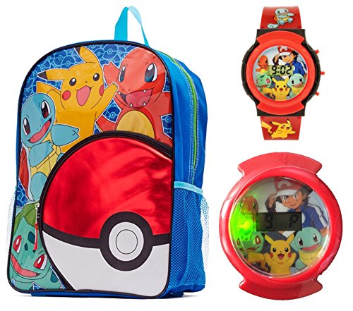Pikachu, Charmander and Pokémon characters go back to school with this backpack set for kids. Bright blue, yellow and red colors. Large compartment for books, laptop, travel accessories and supplies. Mesh side pockets for water bottles. Watch lights flash colors with time and date digital display. A backpack for boys and girls back to school, pens, pencils and supplies. Nintendo game graphics from the toys and games.Feature