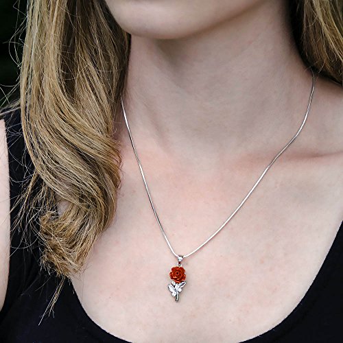 This is a beautiful silvertone crystal stud and red acrylic flower pendant necklace. This deep red acrylic rose is accented perfectly with its sparkling clear crystal leaves! Pendant measures 1 inch in long and 3/8 inch wide and hangs from a 18" silvertone snake chain.Feature