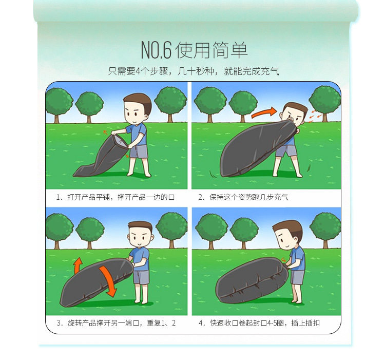 2.封口卷起注意事项:在卷封口的时候一定要对齐用力卷紧,知道卷不动为止,这样口袋充气才会饱满。而且卷的时候一定要尽量平整!否则不美观,而且还容易锁死封口后从封口处漏气的可能!
