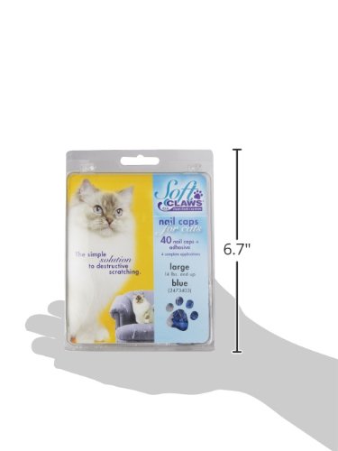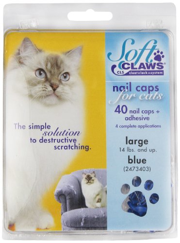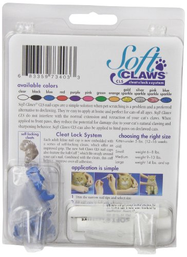 Product Description Soft Claws Nail Caps are a simple alternative to declawing when pet scratching is a problem. They are easy to apply and are perfect for cats of all ages. Soft Claws do not interfere with the normal extension and retraction of your cats claws. When applied to front paws, they reduce the potential for damage due to our cat's natural clawing and sharpening behavior. Kit contains: 40 nail caps, 2 tubes adhesive and glue applicator. Sizes: Kitten, small, medium and large and in color choices of purple, pink, clear, blue and red. Kitten comes in clear only. Most average size cats wear medium. If your cat is very small boned, choose the small size. Very large boned cats tend towards large. Kittens ususally are big enough to wear soft claws by 12 - 16 weeks of age. Directions: To test, try a nail cap on first without the adhesive. If it looks too big, don't glue it on. The nail cap should fit snugly, like a glove. The nail caps can also be trimmed to fit if needed. Kittens up to about 5 months of age and 5 pounds body weight generally fit into the kitten size.