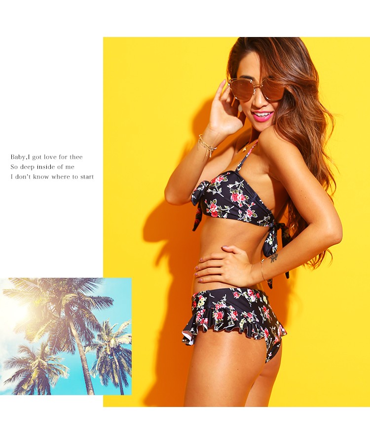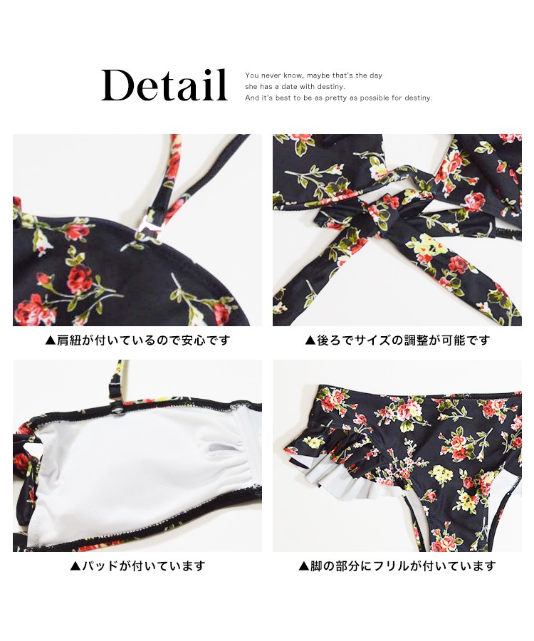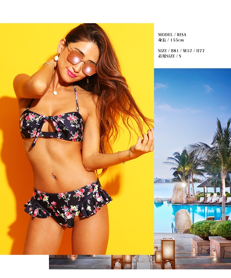 | 商品特徴 | LAVIA(ラヴィア)から新作のプチプラ水着が入荷しました。トレンド感たっぷりな毎年人気のバンドゥタイプは取り外し可能な肩ストラップ付き!2wayタイプで着ていただけます。 胸元が開いたデザインがとってもSexy !ショーツ両サイドについたフリルがさりげなく体系カバーもしてくれます。黒地にローズのデザインで大人ガーリー。 |