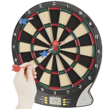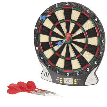 Studio : Uniwide Publisher : Uniwide Binding : Misc. Product Description Teach that amateur or little one how to play darts without risking any injuries using this electronic dartboard. Throw the lightweight ?darts and don't worry about them flying off in different directions. And when they've perfected hitting the board, you can consider upgrading! Perfect for kids and parties. A completely automated way of enjoying Darts. Features over 25 classic dart games including 301, 501, cricket, cut-throat, count-up and more. It also has sound effects and talks you through the game and informs you whose turn it is, and so on. It features a special surface and safe plastic tip darts that you use instead of the regular metal type. 0