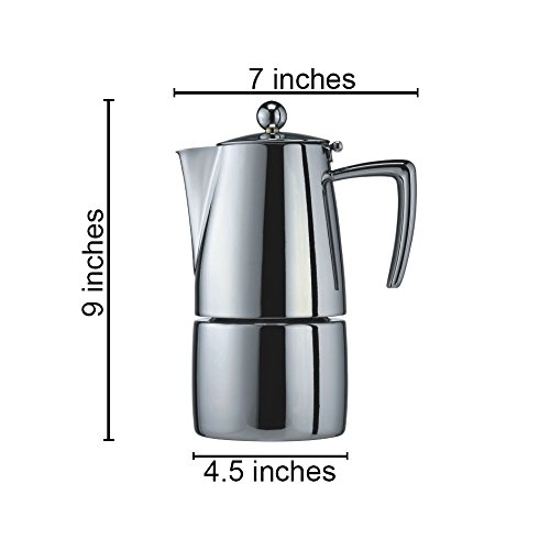 Cuisinox has created yet another premium grade stovetop espresso coffeemaker with a distinguished style and hand crafted to the highest possible standards in the industry. Featuring a heavy gauge 18/10 stainless steel construction polished to a mirror finish, induction base and suitable for all cooking surfaces. This exceptional espresso coffeemaker is beautiful as well as practical.Feature