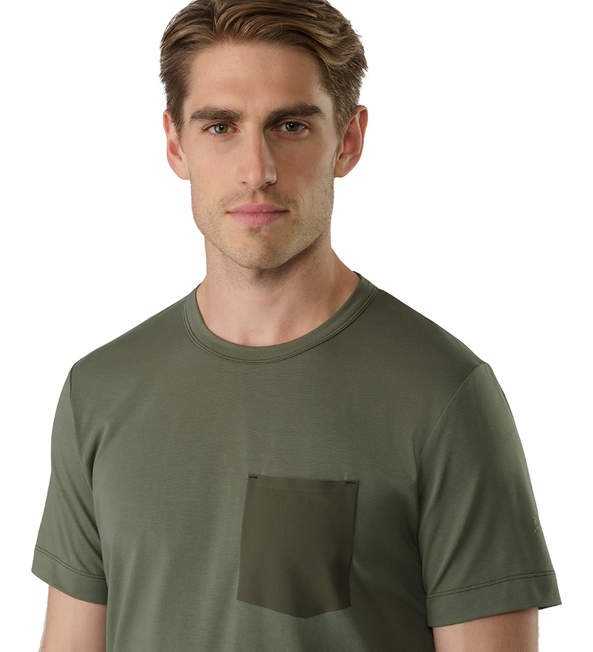 접착공법으로 가슴포켓이 부착되어 독특한 느낌이 나는 깔끔한 디자인의 반팔 티셔츠.