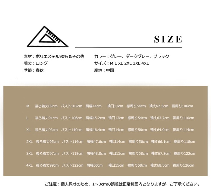 マウンテンパーカー メンズ ジャケット トレンチコート メンズ ロング丈 無地 スプリングコート 大きいサイズ ゆったり 春コート トップス 撥水 アウトドア 2018新作登場 スプリングコート メンズ トレンチコート マウンテンパーカー商品詳細素材:ポリエステル90%&その他着丈:ロング季節:春秋カラー:グレー、ダークグレー、ブラックサイズ:M L XL 2XL 3XL 4XL産地:中国サイズ参照表M 後ろ着丈89cm バスト102cm 肩幅44cm 袖口13cm 襟周り54cm 袖丈62.5cm 裾周り106cmL 後ろ着丈91cm バスト106cm 肩幅45.2cm 袖口13cm 襟周り54cm 袖丈63.7cm 裾周り110cmXL 後ろ着丈93cm バスト110cm 肩幅46.4cm 袖口14cm 襟周り56cm 袖丈64.9cm 裾周り114cm2XL 後ろ着丈95cm バスト114cm 肩幅47.6cm 袖口14cm 襟周り56cm 袖丈66.1cm 裾周り118cm3XL 後ろ着丈97cm バスト118cm 肩幅48.8cm 袖口15cm 襟周り58cm 袖丈67.3cm 裾周り122cm4XL 後ろ着丈99cm バスト122cm 肩幅50cm 袖口15cm 襟周り58cm 袖丈68.5cm 裾周り126cmご注意:個人採寸のため、1~3cmの誤差は正常範囲内となりますが、御了承ください。マウンテンパーカー メンズ ジャケット トレンチコート メンズ ロング丈 無地 スプリングコート 大きいサイズ ゆったり 春コート トップス 撥水 アウトドア 2018新作登場 スプリングコート メンズ トレンチコート マウンテンパーカー