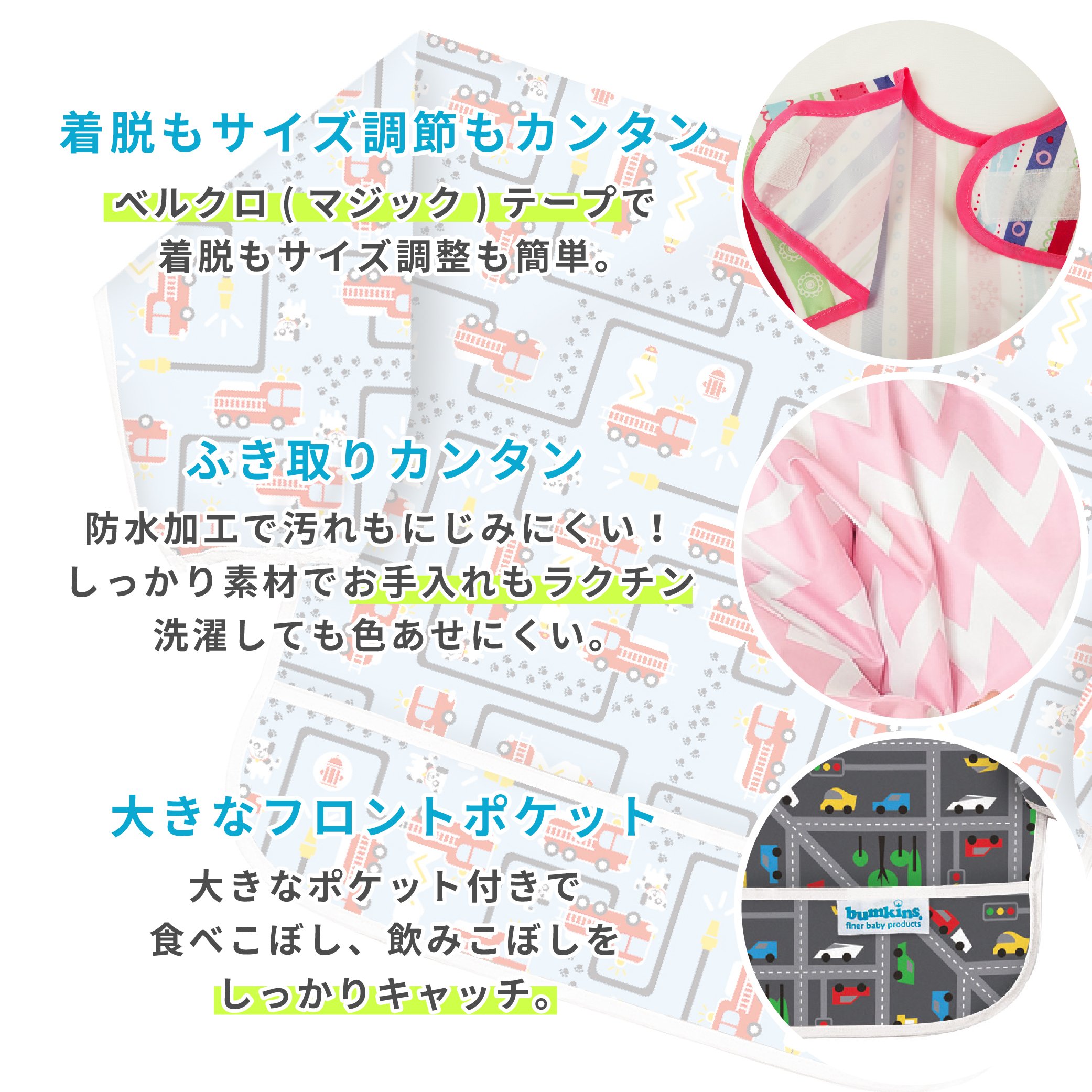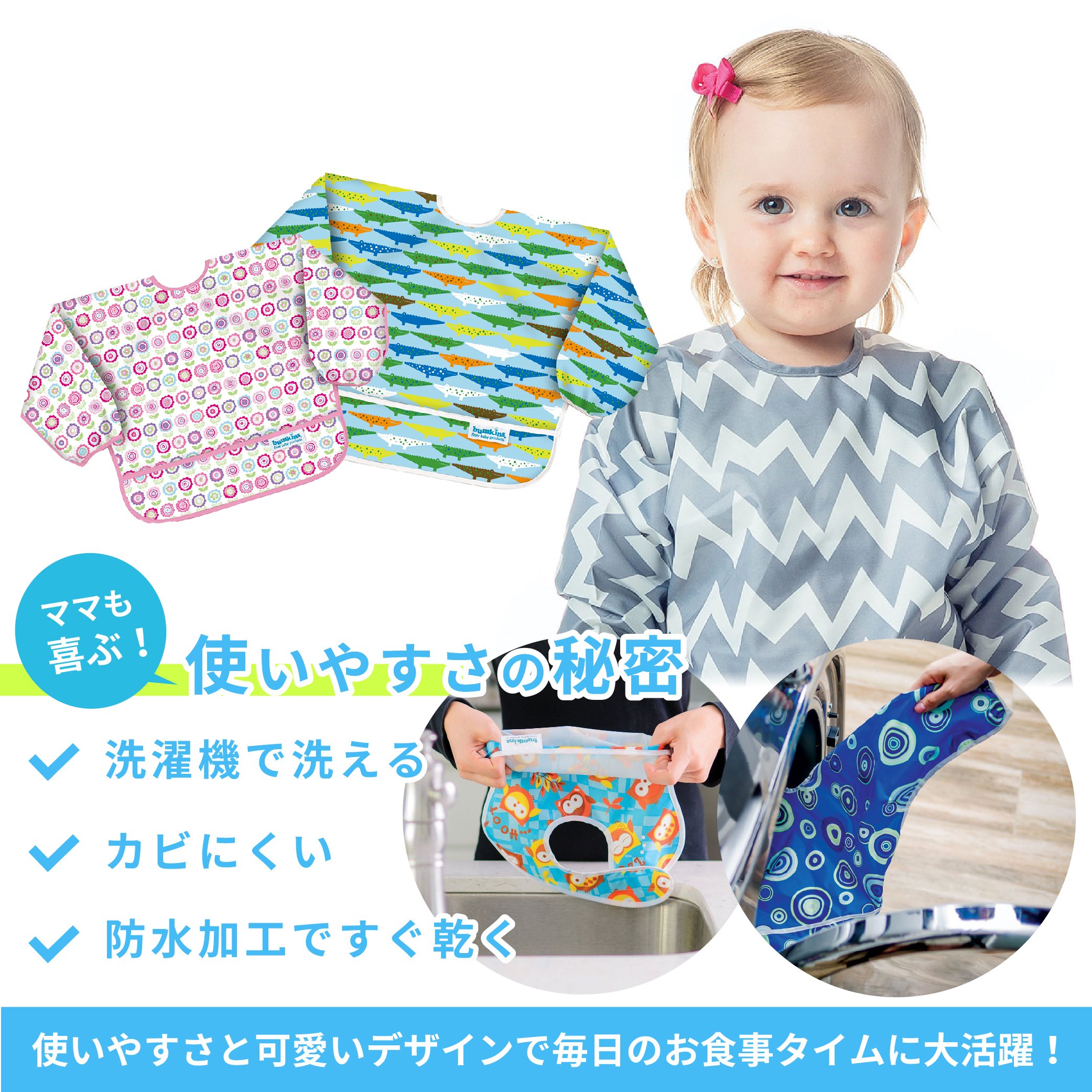 Supports meal with big bibs! Sleeved bibs that can firmly cover wrists.