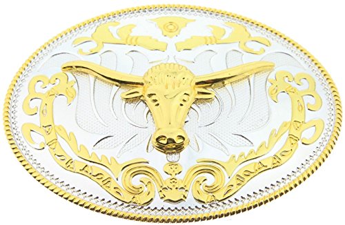 This silver/gold color chrome plated oval rodeo style belt buckle features a gold plated Longhorn Head on the front. It approximately measures 5 inches across, and is 4 inches tall. The buckle fits a belt up to 1 1/2 inches wide.Feature