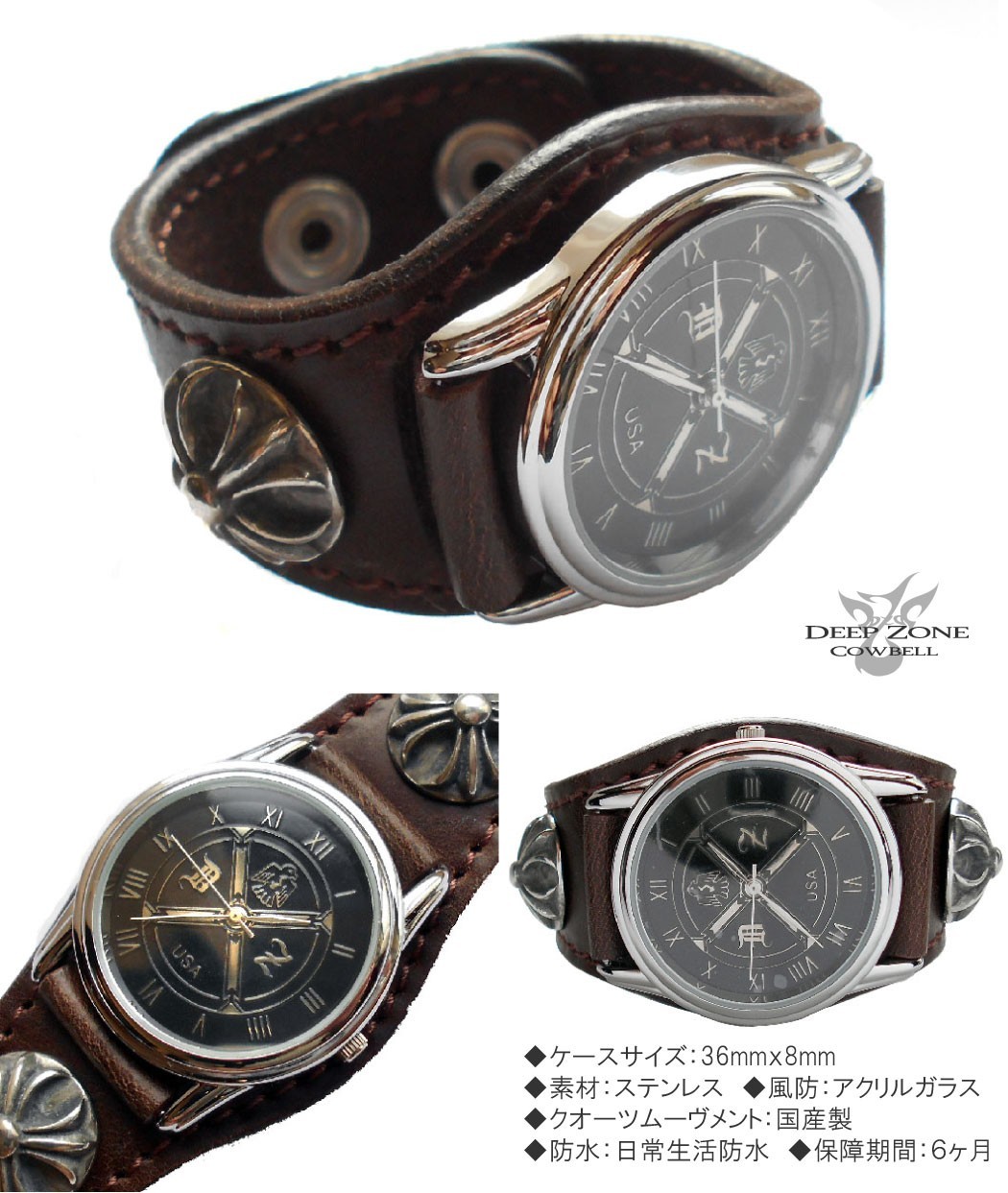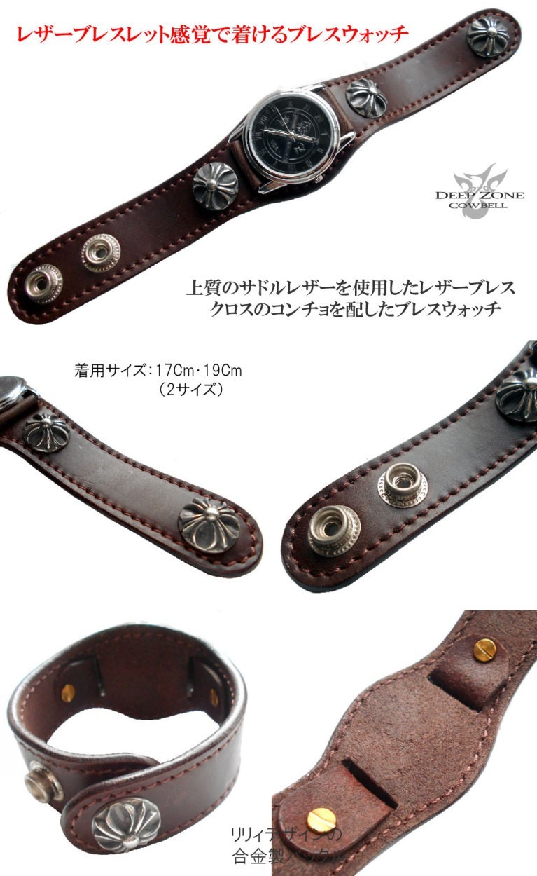 上質のサドルレザー使用した本革ベルトクロスのコンチョにブラックフェイスのムーヴメント! 着用サイズは2サイズ、約17cmと19cmドットボタンで脱着します。ざっくりと腕に巻くお洒落な腕時計 ◆ベルト:牛革 コンチョ:ピューター製◆ クォーツムーブメント:国産 ◆ 防水:日常生活防水◆ ケースサイズ : 36mm × 8mm ◆ 素材:ステンレス◆ Deep Zone専用ケース付き ◆保障期間:6か月◆ 風防素材:アクリルガラス