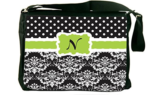 Studio : Rikki Knight LLC Publisher : Rikki Knight LLC Binding : Office Product Product Description Whether from home to the office, on a business trip or to school, the Initial "N" Lime Green black Damask Dots laptop bag notebook bag messenger bag school bag keeps you comfortable and your cargo safe and sound - this bag features pockets on the outside below the flap for your cellphone, pens, iPod, notebook etc. And also a zippered compartment on the inside, with plenty of space to store your textbooks, folders, files, etc. And up to a 14 inch laptop (laptop sleeve sold separately) - the vibrant image on the front is professionally printed and will not fade or peel with time and this bag will surely be an eye catcher wherever you go with it. Disclaimer: all images are printed directly into the material - the Texture of the image will always be a flat surface. Any images that appears to be 3D, textured, or glittery are flat printed images. 0