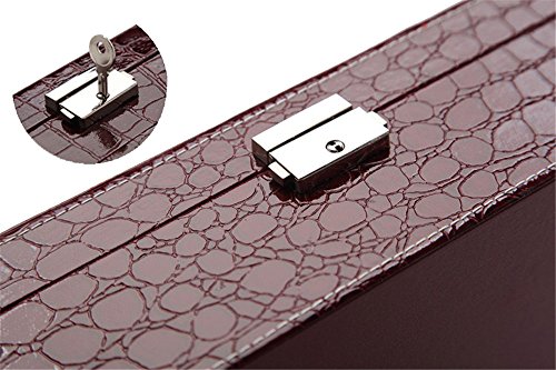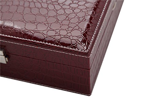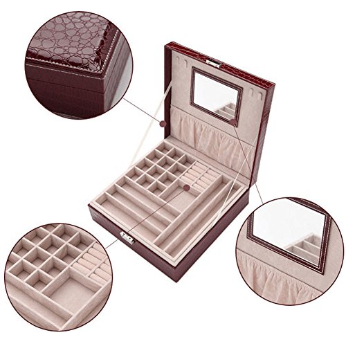 -. Feature : 1.Excellent layout design, attractive appearance, simple structure and fine workmanship, Material: faux crocodile leather, MDF, Velvet,high quality marathon thread overlock. / 2. Product Dimensions (LXWXH): 10.4"x10.4"x3.3" (26.5x26.5x8.5cm) / 3. 2 layers with in-built mirror. There are 4 hooks for hanging earrings or necklaces, mirror and pocket in the cover. In first layer, there are many compartments, theirs depth is 1"(2.5cm). In the second layer, there are 9 removable square cells with size 3.1"x3.1" (8x8cm), 1.2"(3cm) depth. / 4. Top grade material and fashion design, big volume with large capacity for toiletry or jewellery orderly. / 5. Varied sections organize your bracelets, necklaces, rings, watches, cufflinks and badges in good order. Protect your jewelry from dust and scratches. Metal lock key makes it more safety.