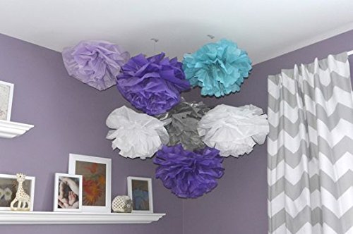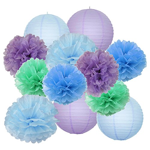 KIT INCLUDES (20PIECES):4pcs paper lanterns of 8 inch in diameter:2*blue+2*lavender;16pcs tissue paper pompom:4*mint+4*blue+4*purple+4*turquoise;Each color comes with 2 sizes: 2pcs 12inch+2pcs 10inch.
