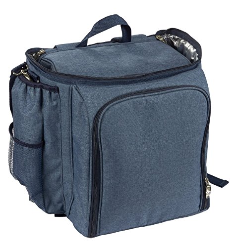 -. Title : Picnic Basket Backpack Set for 4 with Insulated Cooler Compartment, Detachable Wine Bottle Holder, Flatware, Plates, Napkins, Sal & Pepper Shakers, Cutting Board, Bottle Opener and Wine Glasses, Blue