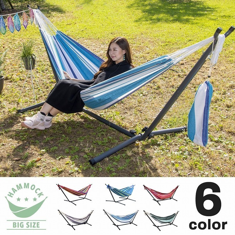 | BIGサイズハンモック | ■ハンモックのある暮らし 見ているだけでもリラックス効果があり、自然な揺れが気持ちのいいハンモック。 女性一人でもかんたんに広げて使用する事ができる自立式になって新登場。 室内でも室外でも使えて場所も取りません。 自立式ハンモックをプラスするだけでお部屋のインテリアを変えることなく、ゆったりとした雰囲気と快適なくつろぎ空間が手に入ります。