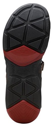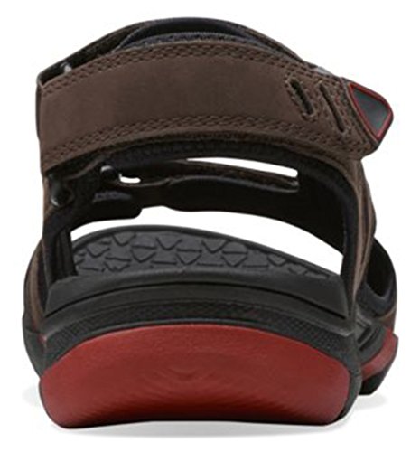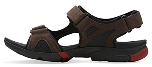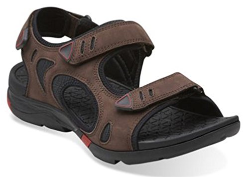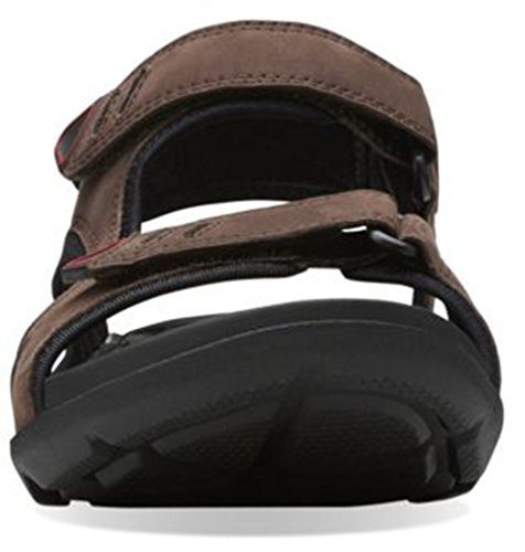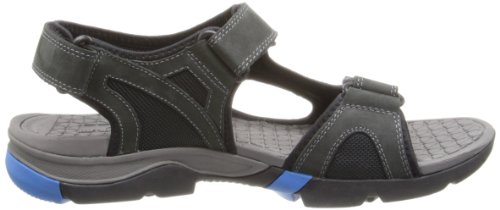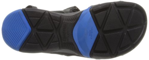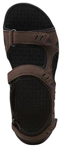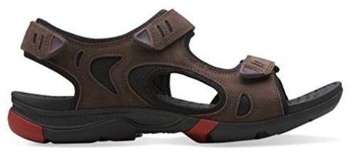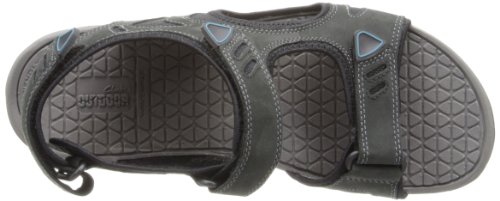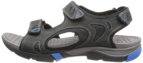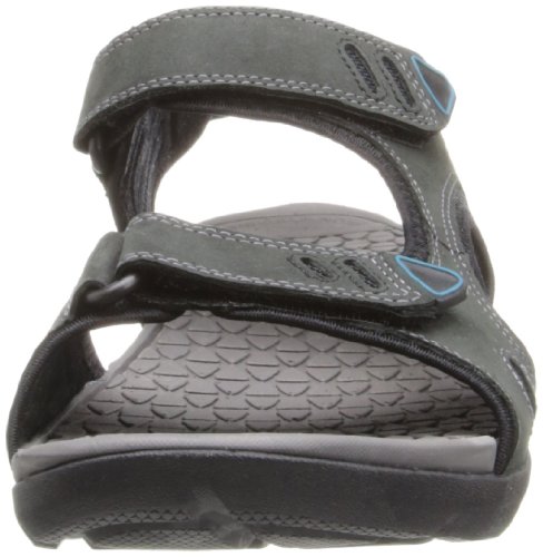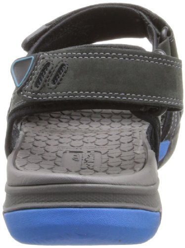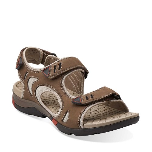 Sporty sandal featuring nubuck upper with contrast stitching and a trio of hook-and-loop straps