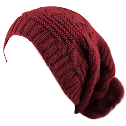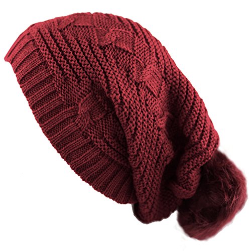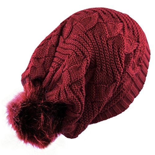 The Hat Depot Women's Faux Fur Pom Long Cable Slouch Knit Beanie Skull Hat