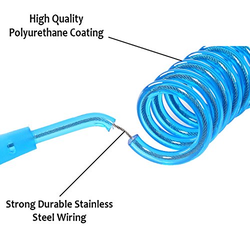 DURABLE & PORTABLE: 98 inches (Nearly 9 feet!) of strong stainless steel cord wrapped in stylish blue PU coating + 360 degrees rotation plus anti-pricking Velcro. Weighing less than half a bottle of water and retracting into a quarter of its stretched size, allowing it to fits easily into most backpacks, purses, and suitcases.