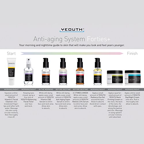 YEOUTH Anti-aging System Forties and above contains: 1x Vitamin C Facial Cleanser to get rid of impurities, 1x Balancing Toner for face to refresh and prep your skin, 1x Vitamin C Serum to help fill in fine lines and wrinkles, 1x Anti-aging Super Serum to deeply moisturize your skin, 1x Retinol 2.5% Serum to repair skin, 1x Neck Firming Cream to improve elasticity and firmness, 1x Radiance Eye Gel to reduce dark circles, and 1x Day/Night Face Moisturizer to nourish and hydrate.