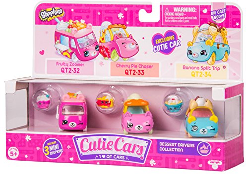 -. Binding : Accessory -. Brand : Shopkins -. Color : Pink -. EAN : 0630996567401 -. Feature : Each pack includes 3 Cutie Cars and their Mini Shopkins! / 1 exclusive Cutie Car in every Three Pack! / There are 4 types of Three Packs to collect! / Die-Cast body with a sweet paint job to match! / New models to collect, 3 Wheel Wonders and Tricked Up Pickups! -. Label : Moose Toys -. Manufacturer : Moose Toys -. Model : 56740 -. MPN : 56740 -. NumberOfItems : 1 -. PackageQuantity : 1 -. PartNumber : 56740 -. ProductGroup : Toy -. ProductTypeName : TOYS_AND_GAMES -. Publisher : Moose Toys -. ReleaseDate : 2018-01-01 -. Size : 2.28'' x 1.3'' x 1.57'' -. Studio : Moose Toys -. Title : Cutie Cars Shopkins Three Pack - Dessert Drivers Collection -. UPC : 630996567401 -. Warranty : No Warranty